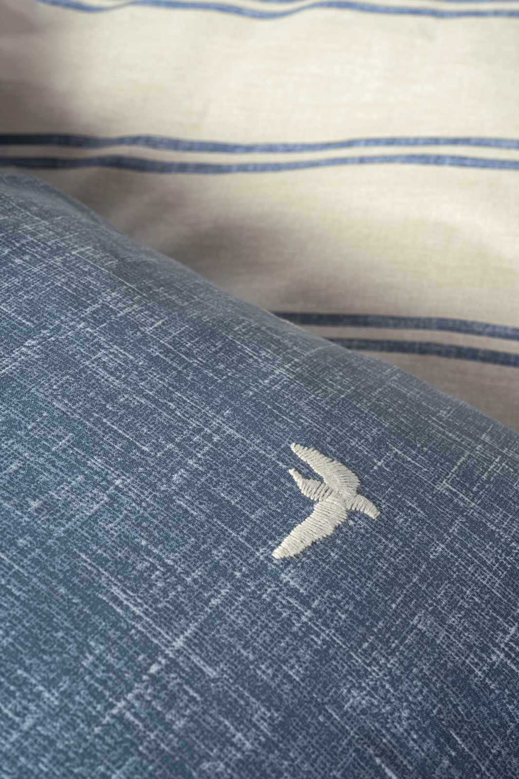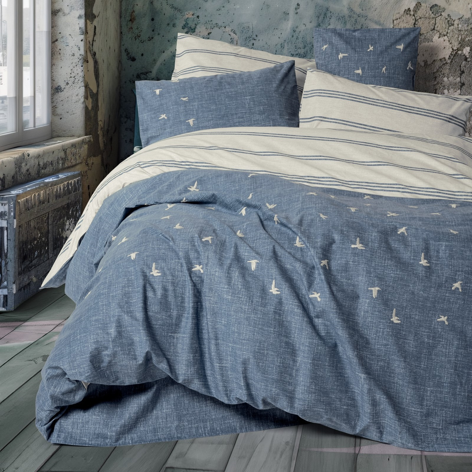 Transformă-ți dormitorul într-un sanctuar de relaxare cu setul de lenjerie Ceria, creat din 100% bumbac ranforce, recunoscut pentru finețea și durabilitatea sa. Inspirată de frumusețea naturii, Ceria combină tonurile de albastru marin cu imprimeuri subtile de păsări în zbor, aducând o notă de serenitate și calm în orice ambient.