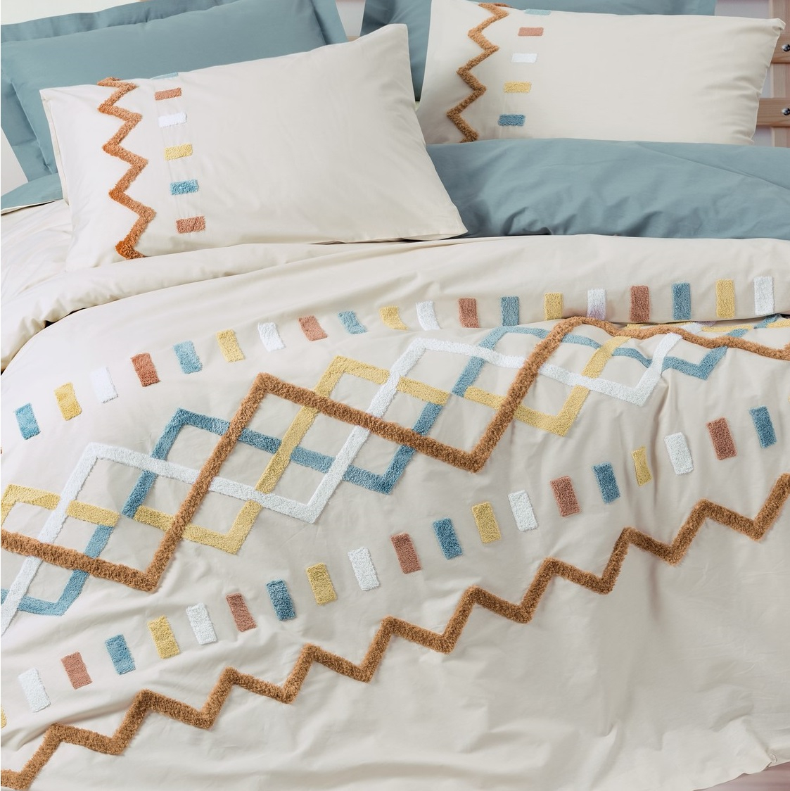 Mellow Mint, creată pentru a aduce un echilibru perfect între simplitate elegantă și confort exclusivist. Realizată din bumbac 100%, 144 TC, de calitate superioară, acest set de lenjerie se evidențiază prin designul modern, cu broderii în relief ce formează un joc geometric plin de viață. Nuanțele blânde de albastru mentă, galben deschis și bej creează o atmosferă proaspătă și reconfortantă, ideală pentru un refugiu personal de lux.