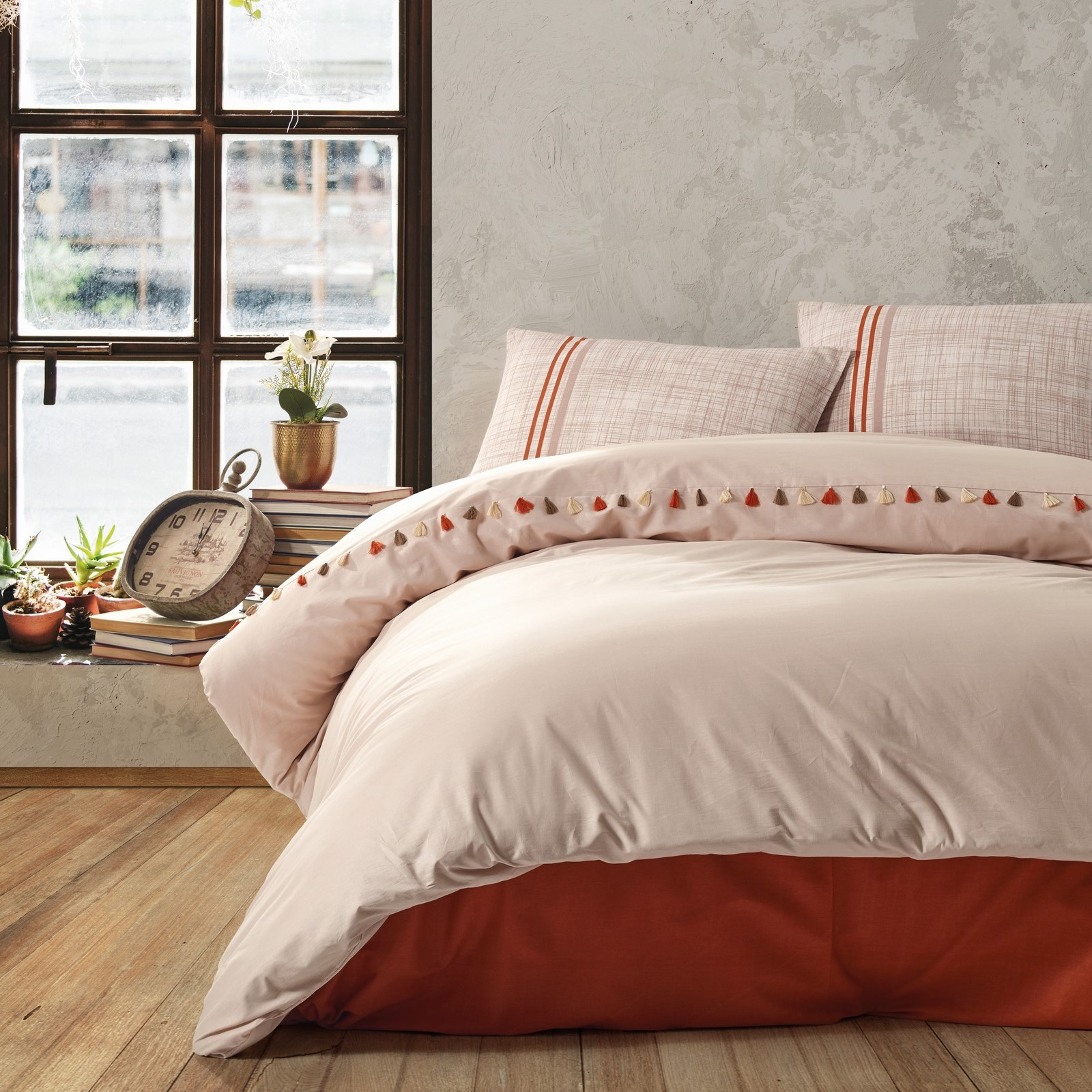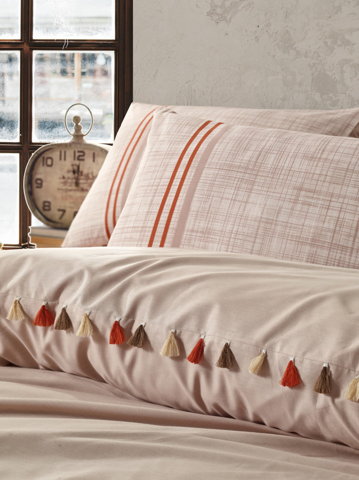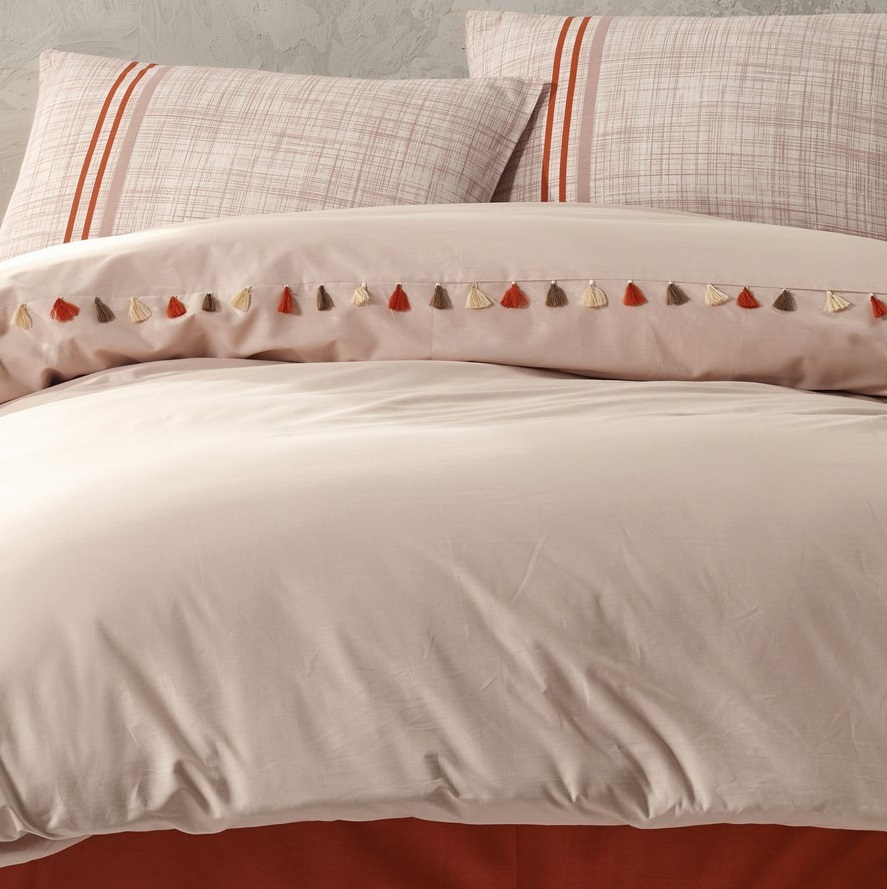 Transformă-ți dormitorul într-un spațiu plin de căldură și confort cu lenjeria de pat Merri, creată din 100% bumbac ranforce de înaltă calitate. Această lenjerie se distinge printr-un design simplu și elegant, completat de detalii delicate, precum ciucurii multicolori care aduc o notă jucăușă și originală. Nuanțele calde de bej, portocaliu și maro deschis se îmbină armonios, creând un decor relaxant, perfect pentru orice dormitor modern.