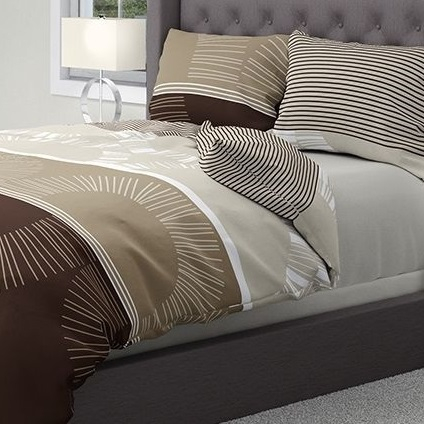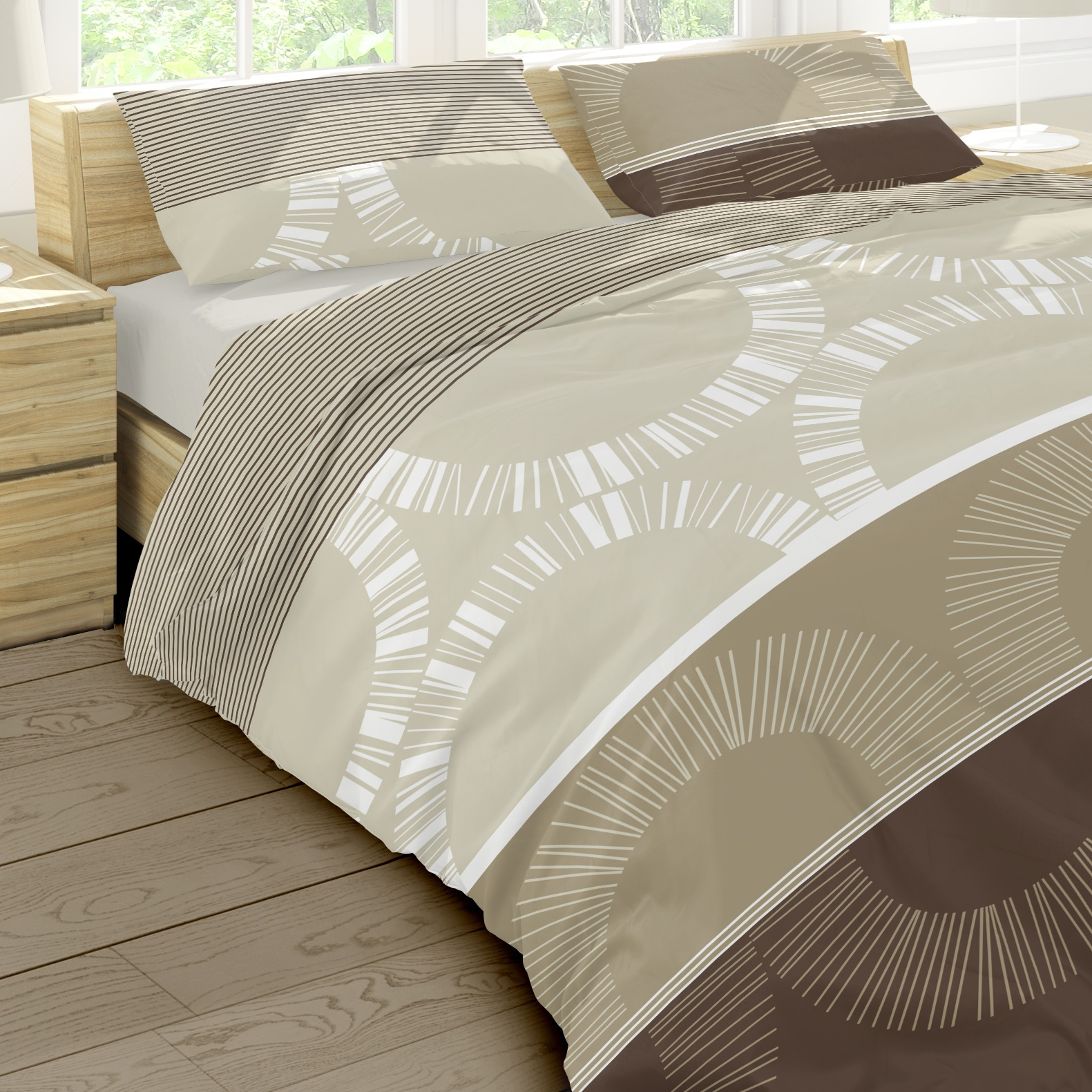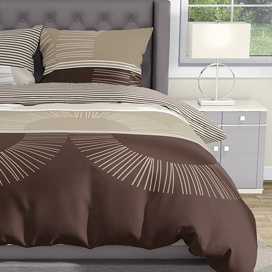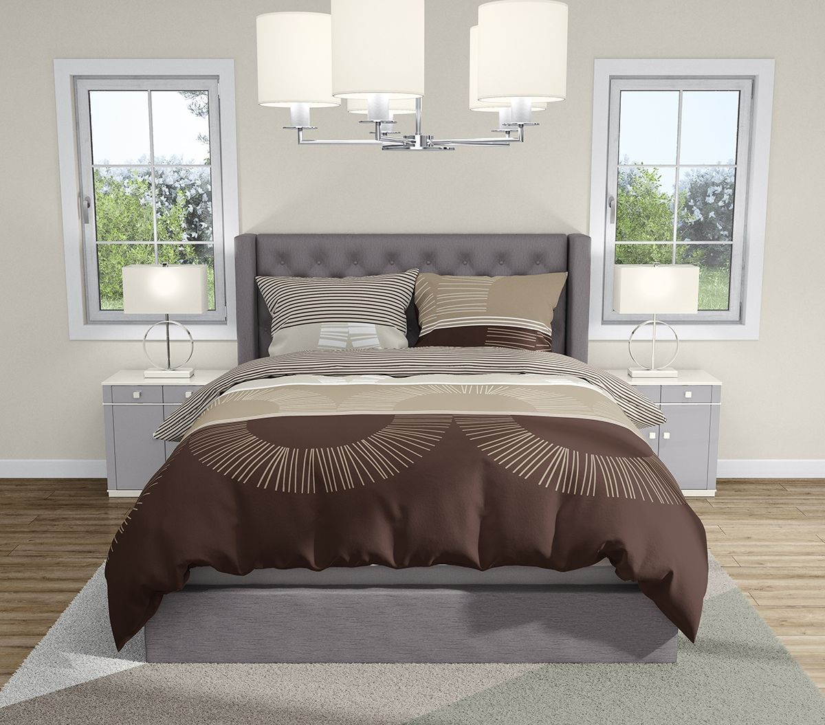 Designul modern în nuanțe calde de cafeniu și accente grafice elegante conferă dormitorului un aer sofisticat, fiind ideal pentru un decor contemporan. Închiderea cu capse asigură o fixare discretă și ușor de utilizat, iar fețele de pernă, fără bordură, sunt prevăzute cu clapetă pentru un aspect finisat și practic.