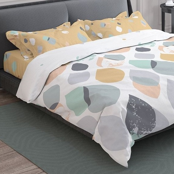 Adaugă un strop de prospețime și energie în dormitorul tău cu lenjeria de pat Serena. Designul jucăuș, cu forme geometrice fluide în nuanțe pastelate de galben, portocaliu, verde mentă și gri, îți transformă spațiul într-un sanctuar al relaxării. Fabricată din bumbac 100% ranforce, această lenjerie îmbină durabilitatea cu o textură moale și delicată, perfectă pentru pielea sensibilă.