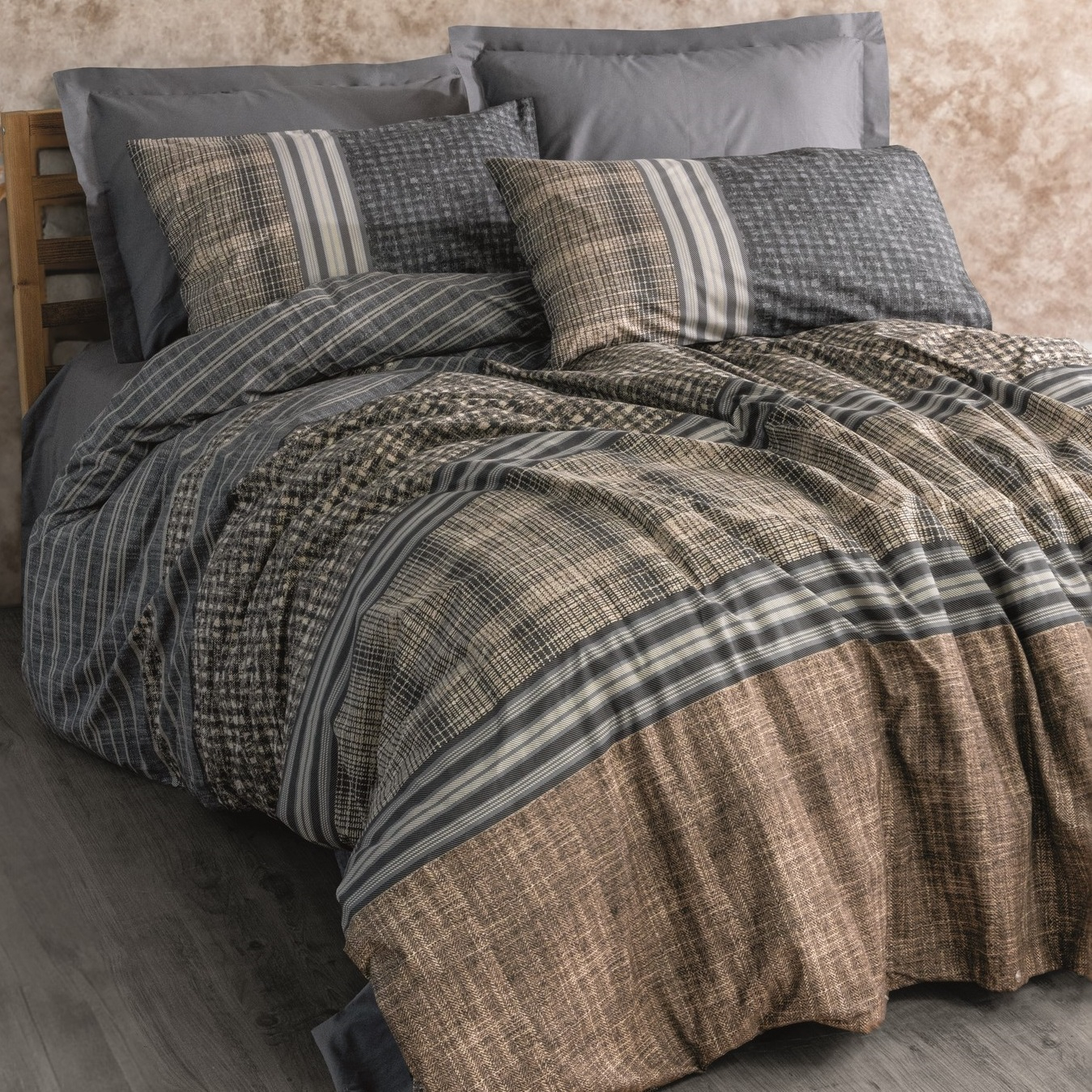 În nuanțe de gri, bej și antracit, designul lenjeriei Timbre este un mix modern între motive naturale și linii geometrice contemporane. Texturile delicate se îmbină armonios, oferind un contrast subtil, dar de impact. Este lenjeria perfectă pentru cei care doresc să aducă un stil contemporan cu influențe urbane în dormitorul lor, păstrând totodată o atmosferă caldă și primitoare.