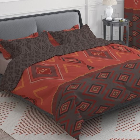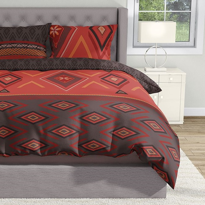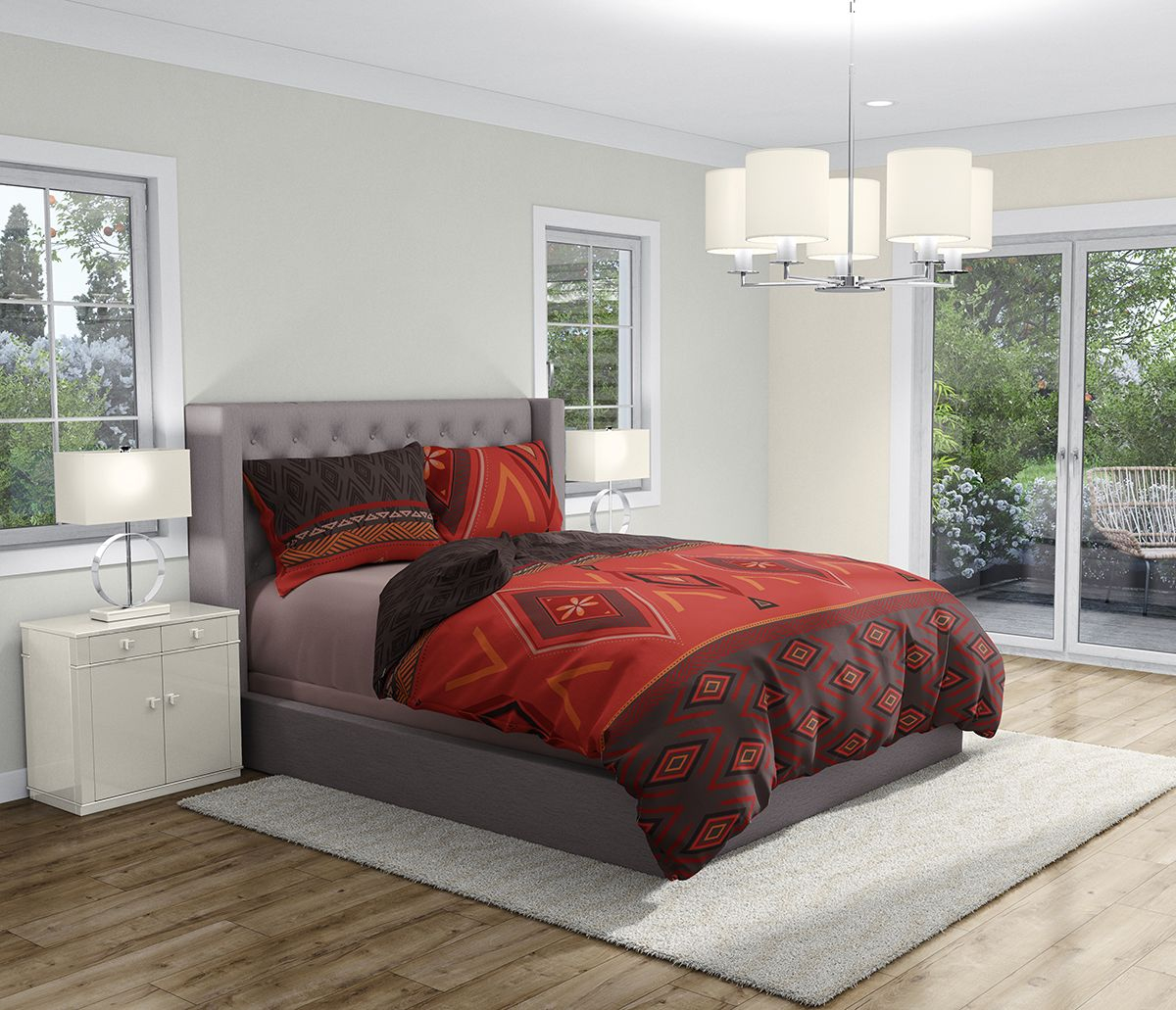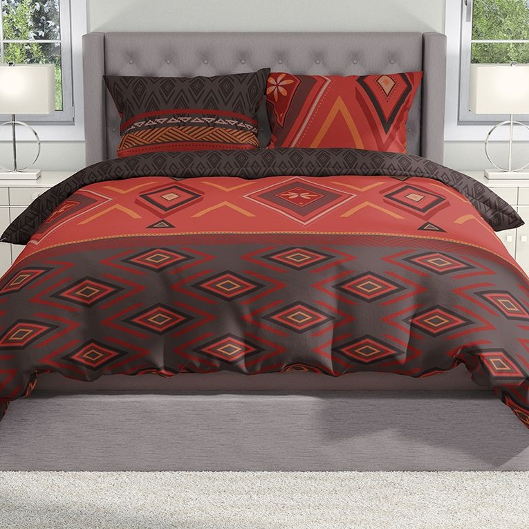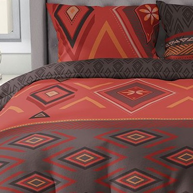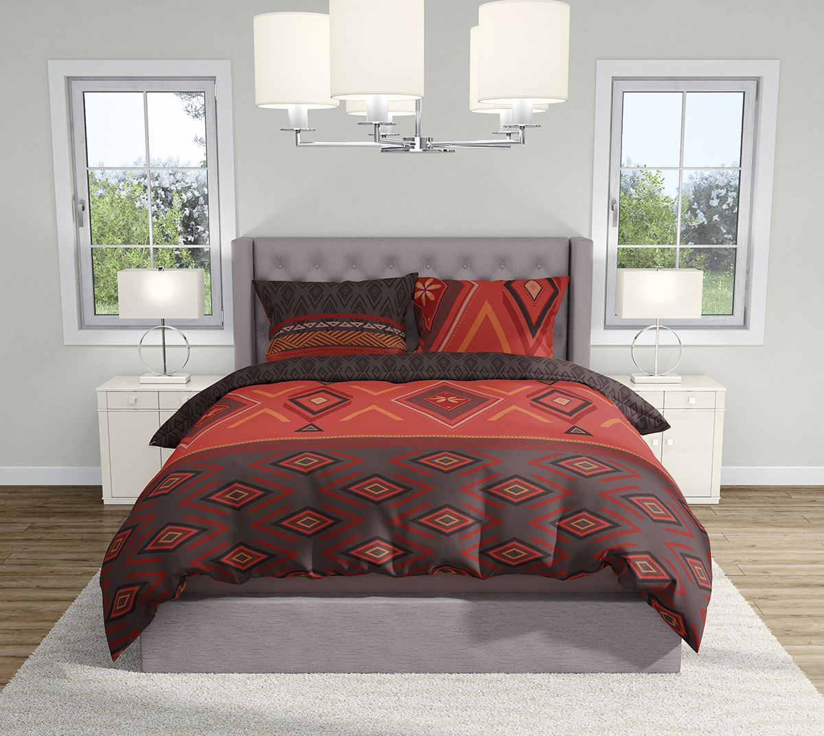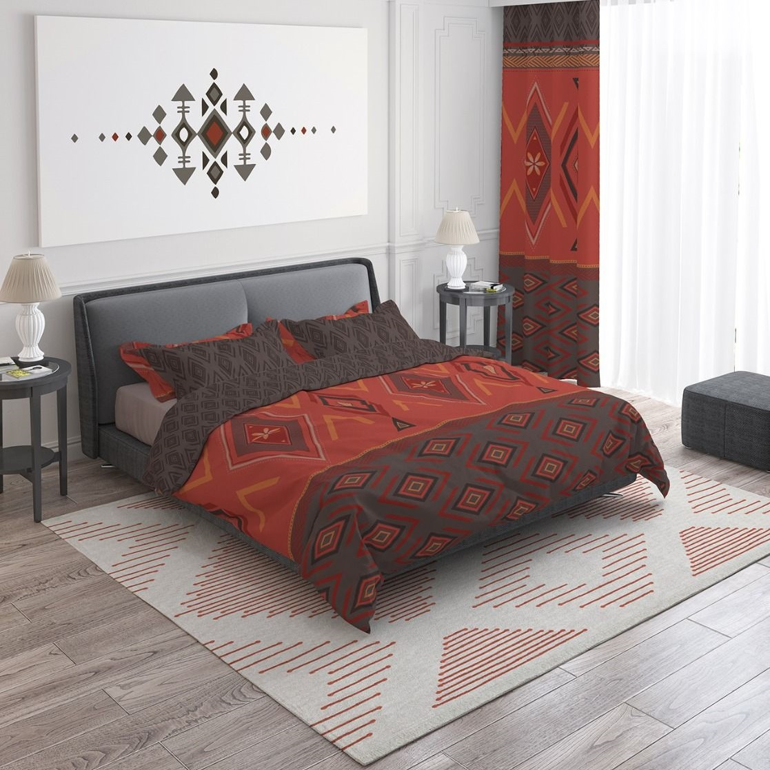Designul Zahira este marcat de motive geometrice etnice în nuanțe intense de roșu, portocaliu, și maro închis, creând o combinație fascinantă care evocă rădăcini culturale profunde. Modelele în formă de diamant și liniile stilizate sunt aranjate într-un mod ce sugerează dinamism și armonie, aducând în prim-plan influențe tradiționale reinterpretate într-o manieră modernă. Această lenjerie de pat este potrivită pentru cei care doresc să aducă în spațiul lor de odihnă o notă de aventură, căldură și un strop de exotic.