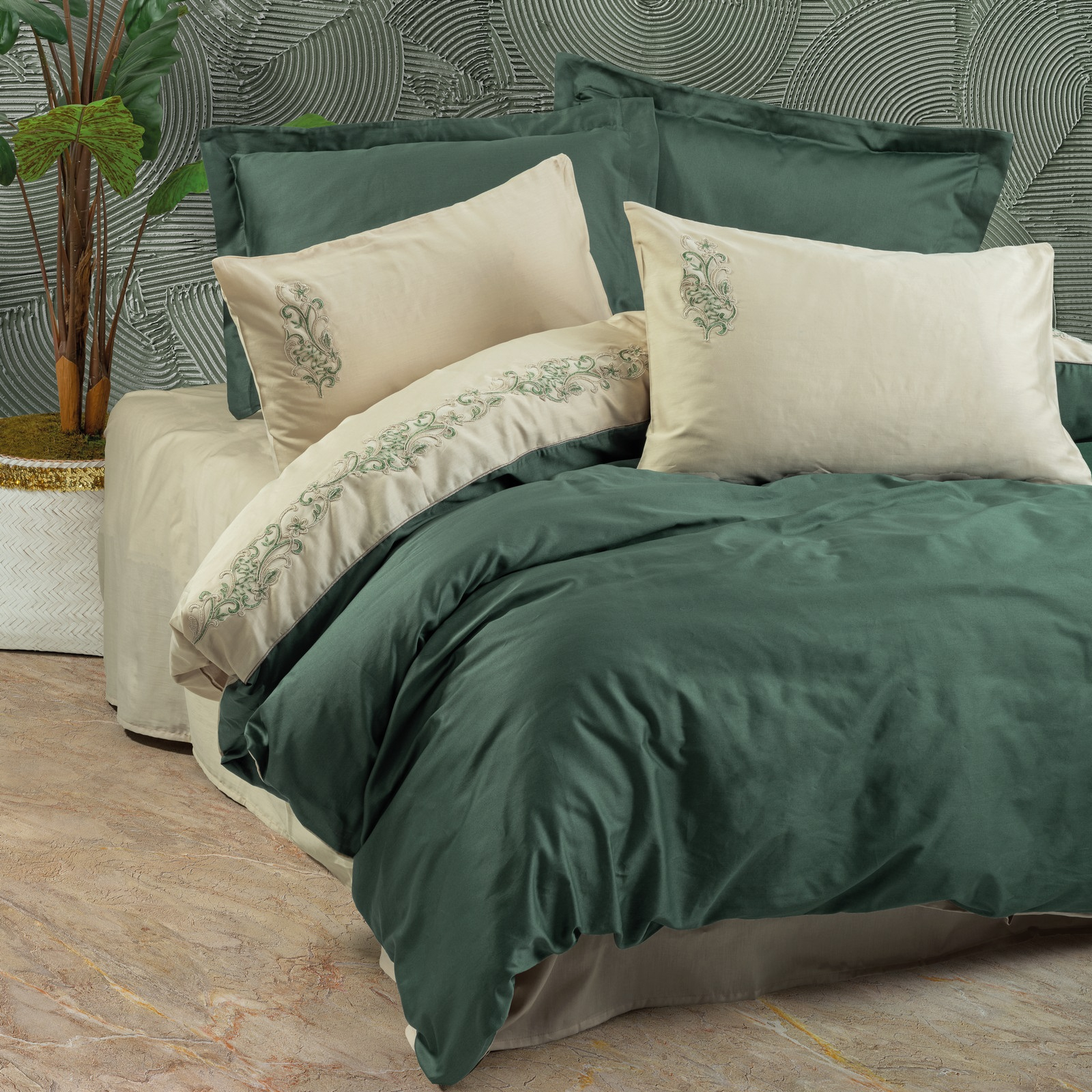 Transformă-ți dormitorul într-un spațiu de relaxare sofisticată cu lenjeria de pat Andy, realizată din bumbac satinat 100%, cu o densitate de 210 TC, ce asigură o senzație plăcută pe piele și o durabilitate remarcabilă. Tonurile de verde și detaliile brodate delicate aduc un omagiu frumuseții naturale, integrând armonios eleganța subtilă în decorul dormitorului tău.