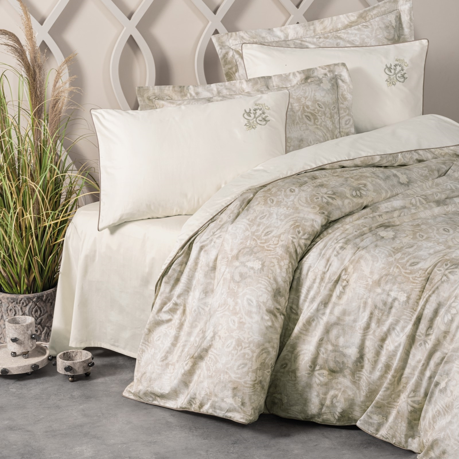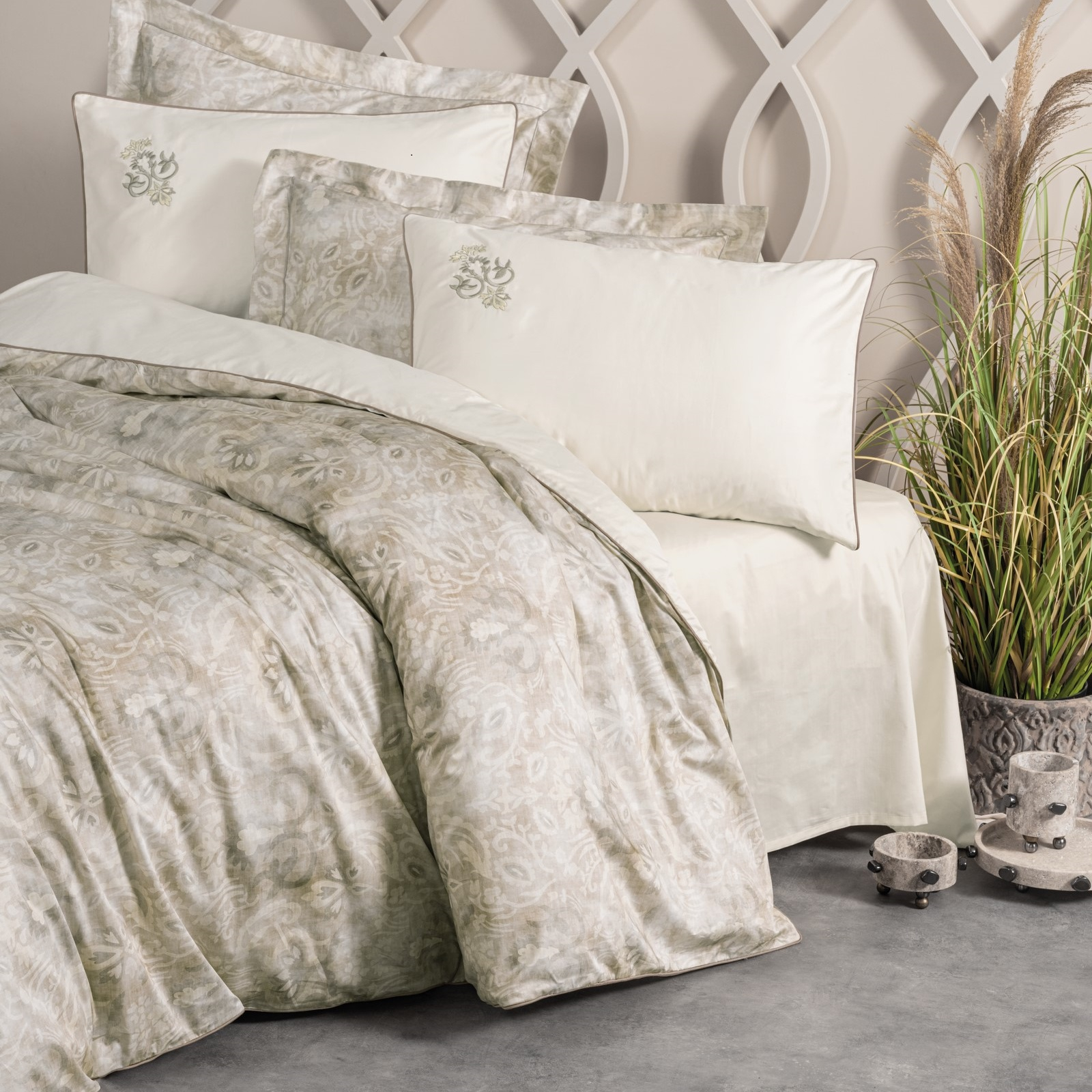 Realizat din bumbac satinat premium, fiecare fir din lenjeria Beatrix a fost selectat cu cea mai mare grijă pentru a asigura un finisaj rafinat, perfect pentru pielea delicată. Acest bumbac satinat, cu o țesătură densă de 300 TC, oferă o senzație răcoritoare vara și menține căldura optimă în nopțile reci, asigurând o textură plăcută și confortabilă în fiecare sezon. Finisajul lucios și rezistența excepțională a materialului completează perfect designul exclusivist, fiind ideal pentru dormitoarele care reflectă stilul sofisticat și luxul discret.