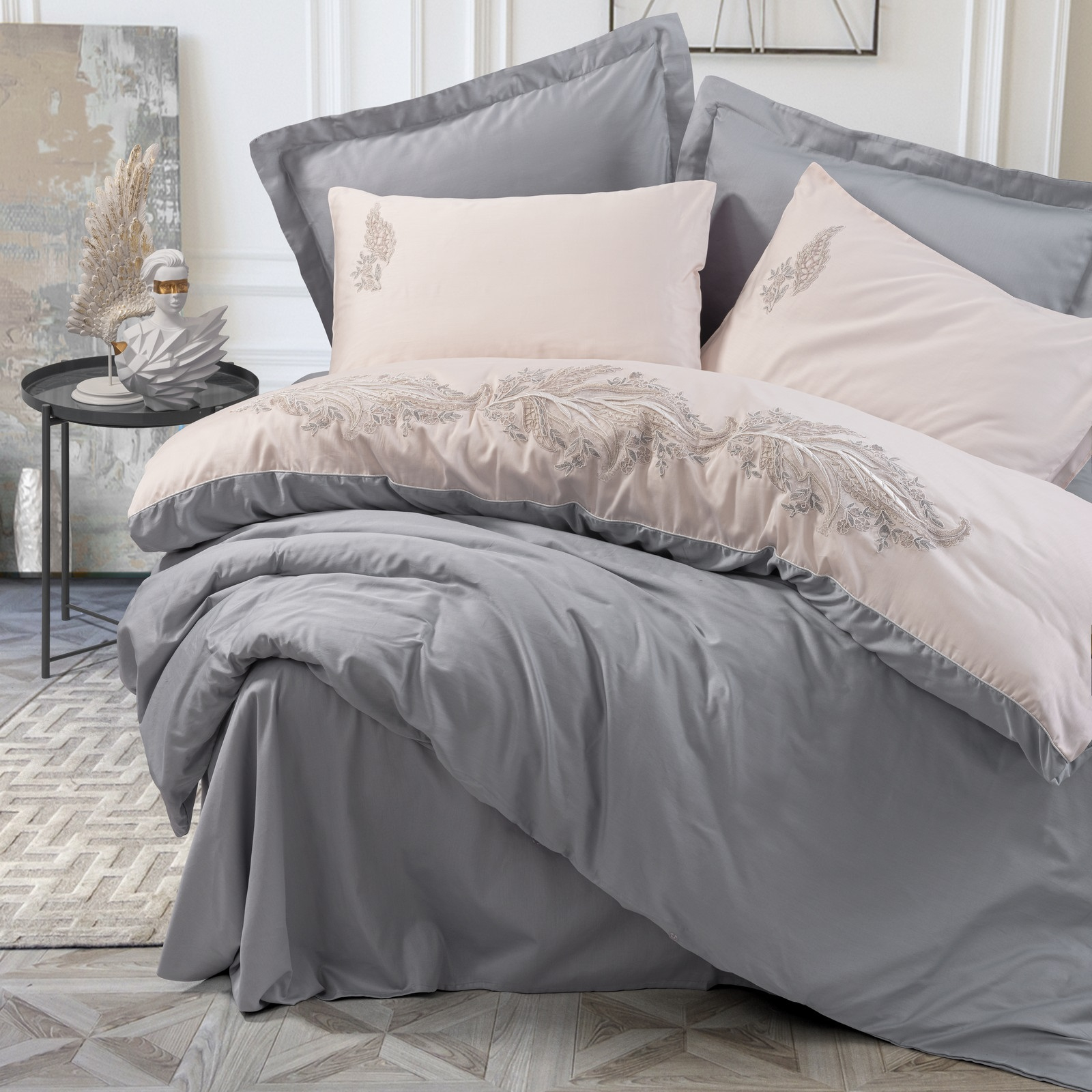 Cu o textură catifelată și broderii delicate, lenjeria Sheen este concepută pentru a aduce un plus de eleganță în dormitorul tău. Realizată din bumbac satinat de calitate superioară, această lenjerie îmbină luxul discret cu un confort remarcabil, oferindu-ți o experiență de somn rafinată.